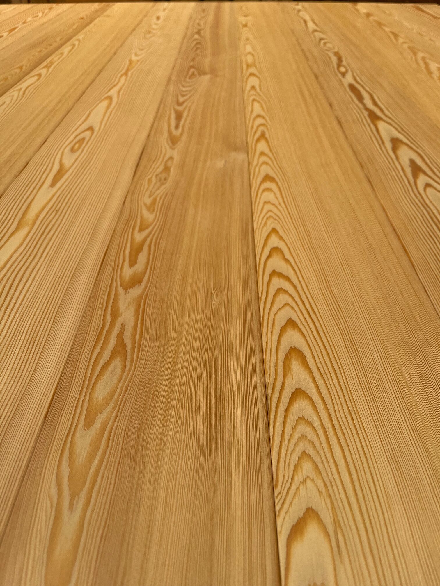 カラマツは針葉樹の中でも比較的硬さがあり、日常の歩行や生活動線にも配慮した実用性を備えています。また油分を含む樹種のため、使い込むほどに表面に自然な艶が生まれ、色味が徐々に深まり、時間とともに味わいを増していく経年変化も大きな魅力です。三層構造による寸法安定性と、素材が持つ美しさ、将来の変化を楽しめる価値をバランスよく備えた、長く付き合えるフローリングです。